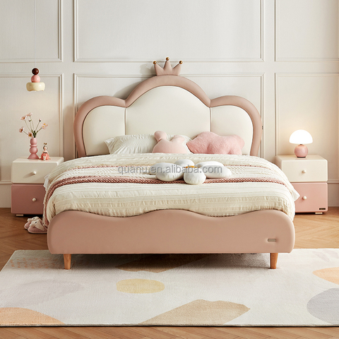 116098 Quanu crianças mobiliário Crown Design couro crianças cama redonda afiação rosa couro princesa cama Frame para meninas